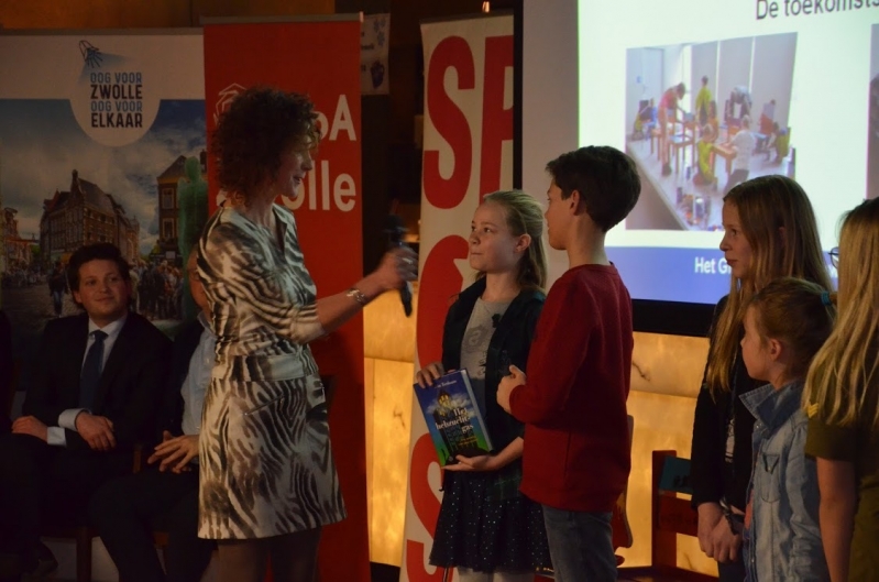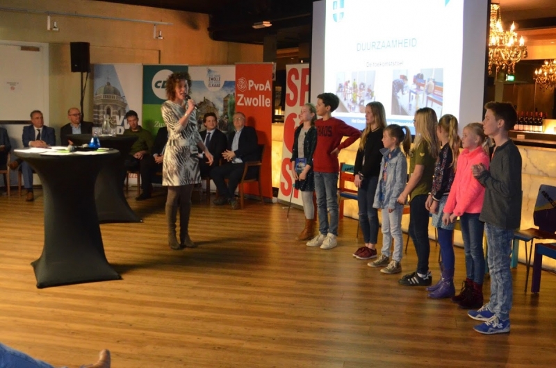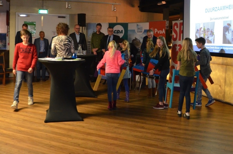 De politieke partijen uit Zwolle gingen met elkaar in debat. Als start bij het onderdeel 'duurzaamheid' heeft Elise voorgelezen uit het boek van Jan Terlouw. Daarna ontvingen alle acht partijen een toekomststoel van een van de kinderen van de leerlingenraad.